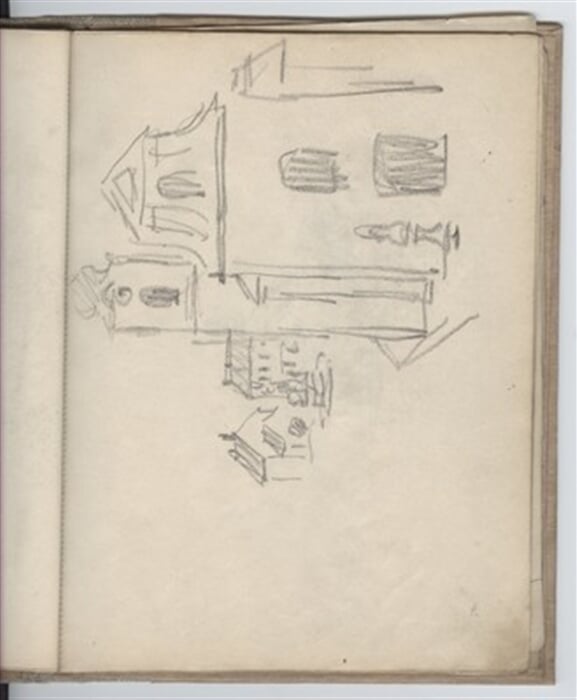 přední strana listu: 4 kresby pasoucích se krav, zadní strana listu. Kresba ploché otevřené krajiny s domem